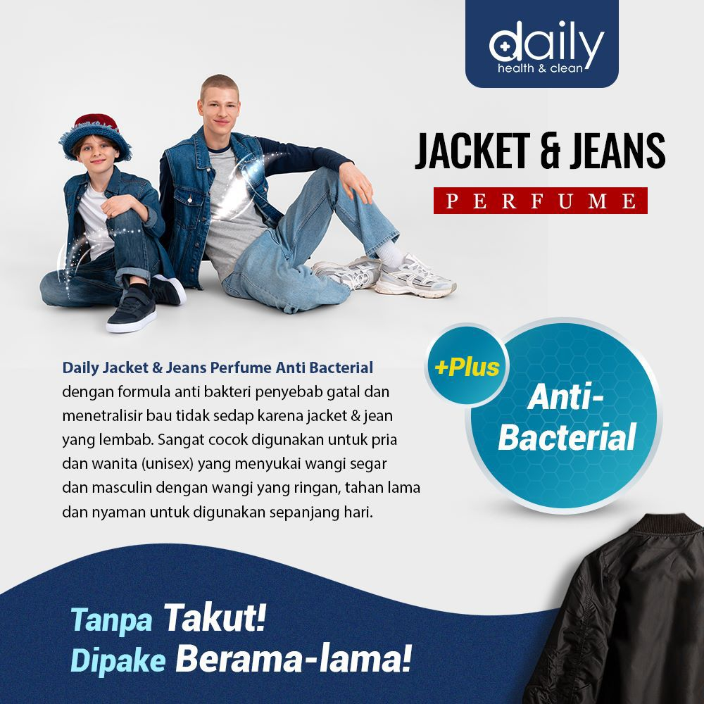 Daily Jacket & Jeans Perfume Anti Bacterial dengan formula anti bakteri penyebab gatal dan menetralisir bau tidak sedap karena jacket & jeans yang lembab. Sangat cocok digunakan untuk pria dan wanita (unisex) yang menyukai wangi segar dan masculin dengan wangi yang ringan, tahan lama dan nyaman untuk digunakan sepanjang hari.