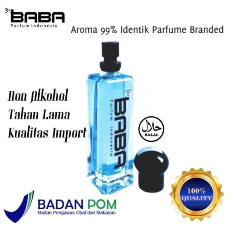 Parfum inspirasi terbaik. SUPER PREMIUM by Baba Parfum : • Dibuat dengan konsentrat import asli Paris • Wanginya soft, sangat enak dan tidak menyengat. • TAHAN LAMA, rata-rata lebih tahan lama, dengan wangi yang soft, di kulit bisa tahan 8-12 jam lebih. Di pakaian, kadang sudah dicuci pun wanginya masih ada (ini 100% testimoni dari customer). • Tidak mengandung zat-zat berbahaya. • Tidak berbekas noda di baju. • Tidak lengket, tidak panas di kulit, tidak gatal, tidak bikin kulit iritasi / memerah. 100% aman di kulit dan pakaian. • Harga jauh lebih murah dari parfum originalnya. • Untuk kualitas, sudah pasti ini The Best nya.