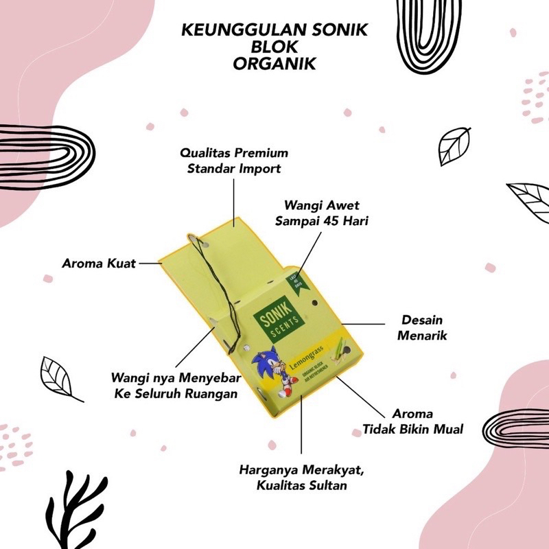 Q: Apa sih, produk Sonik Scents Block Organik ? A: Parfum mobil Sonik Scents berbahan dasar Block Organik yang diolah sedemikian rupa oleh ahli kimia agar ketahanan aroma semakin lama , tidak perlu khawatir akan kebocoran atau tumpah , krna bukan terbuat dalam bentuk cairan. dan packaging di lapisi alumunium foil agar produk tetap terjaga kualitas nya sampai ketahan konsumen. - sangat cocok untuk digunakan untuk : Parfum Mobil, Parfum Ruangan, Parfum Toilet,Parfum Kamar