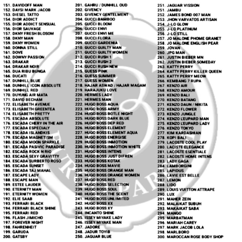 parfum refill wangi searah parfum original nya dengan harga paket murah. barang ready stock, kami menerima partai besar. pengambilan banyak ada harga khusus, silahkan tanyakan di chat untuk harga reseller.