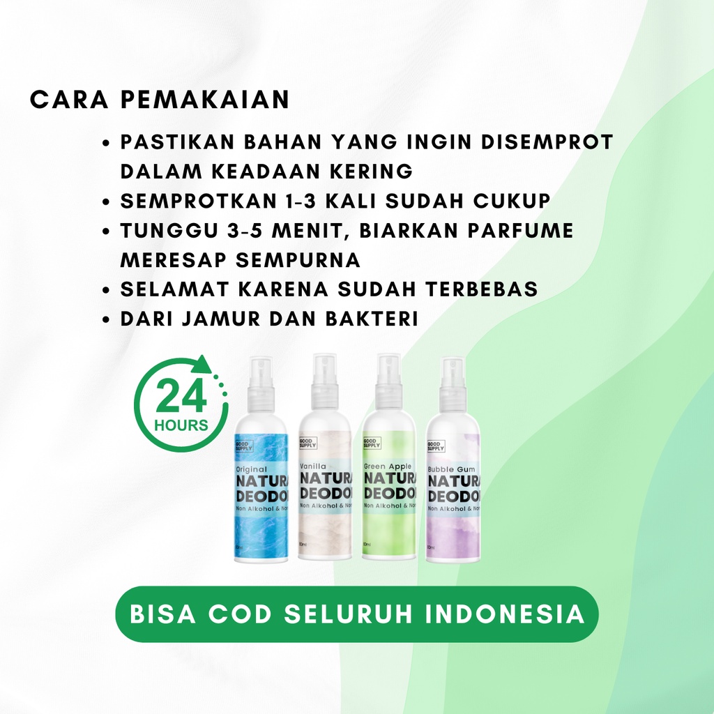 Parfum Aroma Original Segar, Untuk Aroma Lainnya Bisa Klik Ditoko Kami . Garansi 100% Uang Kembali ! Jika Produk Tidak Sesuai Gambar Dan Deskripsi Jika Produk Rusak Saat Diterima Jika Produk Tidak Berfungsi Sebagaimana Mestinya . MANFAAT PARFUM GOOD SUPPLY 1. Anti Bakterial Dan Jamur, Selatin Memberikan Wangi Yang Fresh, Parfum Good Supply Dapat Membunuh Dan Membasmi Bakteri, Jamur Penyebab BAU Tak Sedap 2. Multi Fungsi, Dapat Digunakan Untuk Sepatu, Helm, Jaket, Ruangan Mobil, Dan Lainnya 3. Banyak Variant Aroma, Ada Aroma Vanila, Green Apple, Bubble Gum Dan Original . Cara Pakai : pastikan bahan yang ingin disemprot dalam keadaan kering semprotkan 1-3 kali sudah cukup tunggu 3-5 menit, biarkan parfume meresap sempurna selamat karena sudah terbebas dari jamur dan bakteri . UDAH DISEMPROT MASIH BAU ? 100% uang kembali
