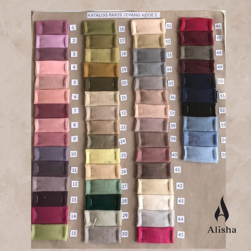 • Ada efek SHINE/MENGKILAP/Glossy pada kain • Label besi alisha • Kode warna sama dengan Paris Jepang Premium ( Karena bahan dasar Paris Jepang Ultima dari Paris Jepang Premium yang di shine-kan )