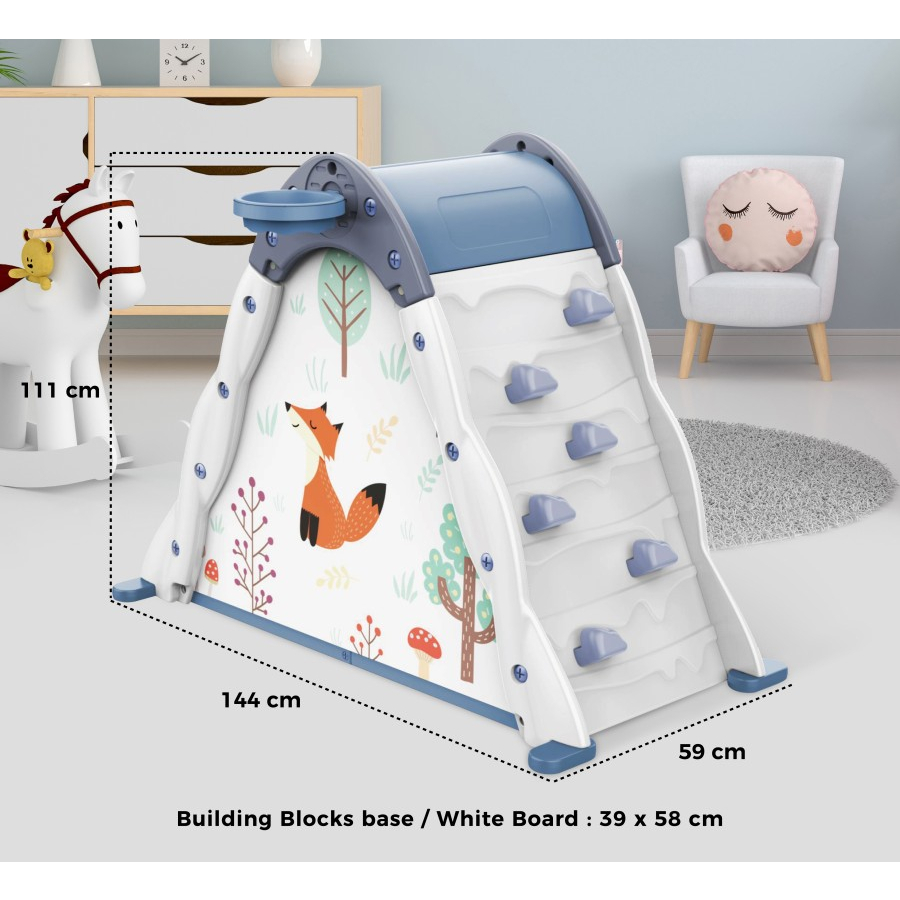 Fitur: - Basket Ball: mendorong tubuh anak bergerak dan berkoordinasi, sehingga kekuatan dan daya tahan tubuh mereka dapat terlatih dengan sempurna. - Base Building Blocks: melatih kreatifitas. - White Board: digunakan untuk belajar, menggambar dan melukis sambil bermain. - Activity Climbing: digunakan untuk melatih otot dan tulang anak, koordinasi tangan dan kaki, meningkatkan kesigapan dan mengasah keseimbangan.