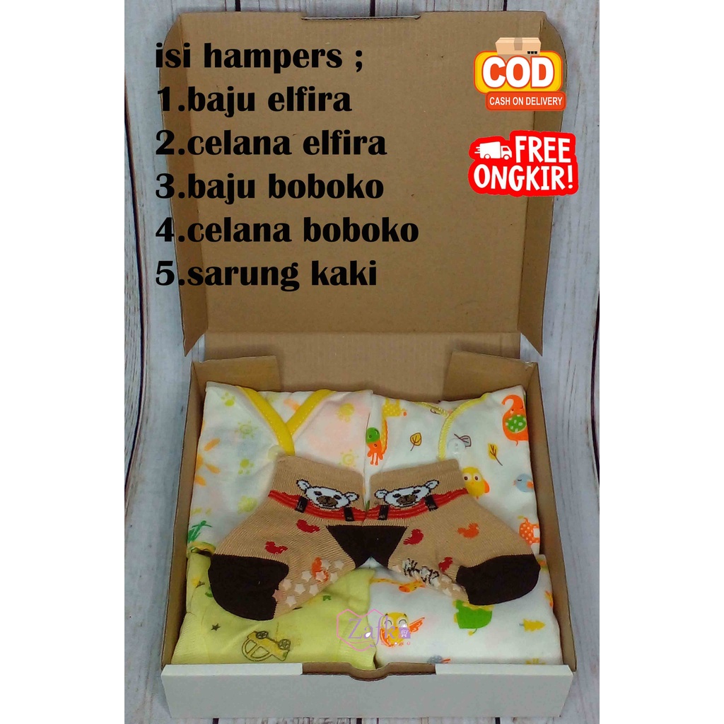 isi hampers ; 1.baju elfira 2.celana elfira 3.baju boboko 4.celana boboko 5.sarung kaki (kaos kaki kami kirim random sesuai stok)
