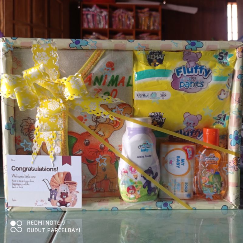 Parsel hantaran bayi baru lahir murah ekonomis. Isi parsel terdiri dari : ~ Baju bayi(atasan saja) ~ 1pcs diapers (merk menyesuaikan) ~ Bedak bayi kodomo 50 gr ~ Sabun bayi ~ Shampoo bayi kodomo 45 ml(warna menyesuaikan stok yg ada) ~ Free kartu ucapan dengan bahan art paper glossy/mengkilap ~ Ukuran parsel 30 x 20 cm ~ Mohon maaf untuk motif kertas kado pada box tidak harus sesuai dg foto,kami buat dan kirim menyesuaikan stok yang ada🙏