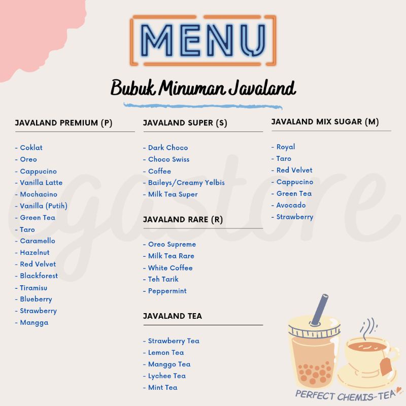 Bubuk minuman rasa kemasan 500gr merek Javaland Premium. Dengan varian rasa yang nikmat dan berbeda. Untuk minuman bubble drinks, milk shake, ice blended, tambahan perasa silky puding, kue cubit, dan lain lain.
