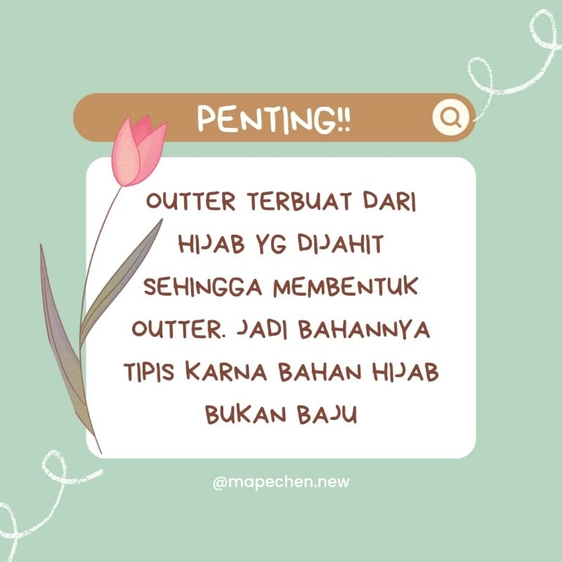 OUTTER SCARF Matt : VOAL PREMIUM SCARF ( Diingatkan untuk TIDAK berekpektasi TEBAL karena bukan bahan baju. Outter terbuat dari bahan VOAL SCARF terbaik No. 1 di kelasnya ) dijahit kalong membentuk outter.
