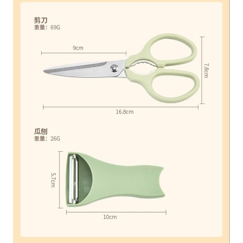 Terdiri dari 2 macam : - 1 pcs gunting 16,8 cm x 7,8 cm untuk memotong buah2, sayur2an dan sejenisnya - 1 pcs parutan Ukuran 10 x 5,7 cm Dapat memarut dan mengupas kulit baik itu buah-buahan maupun sayur-sayuran.