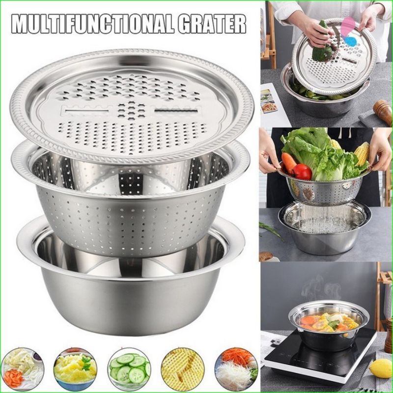 Detail Parutan Serbaguna SET 3 in 1 STAINLESS Drain Basin Rice Washing Strainer Set Kitchen Grater Set Bowl Parut Iris Potong Serut Es Sayuran