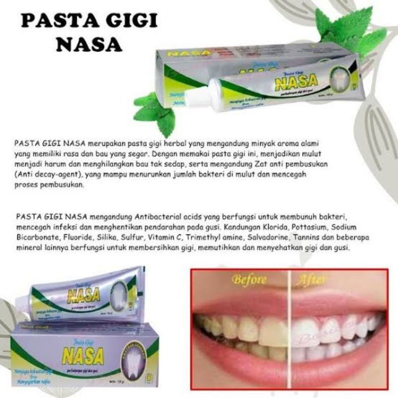 Pasta gigi Nasa adalah salah satu jenis pasta gigi yang memiliki kandungan minyak alami. kandungan flouride alami di dalam pasta gigi Nasa ini memberikan dampak efektif untuk membasmi kuman serta bakteri di dalam gigi dan mulut. Pasta gigi Nasa adalah salah satu pasta gigi yang bisa memberikan aroma alami untuk mulut.