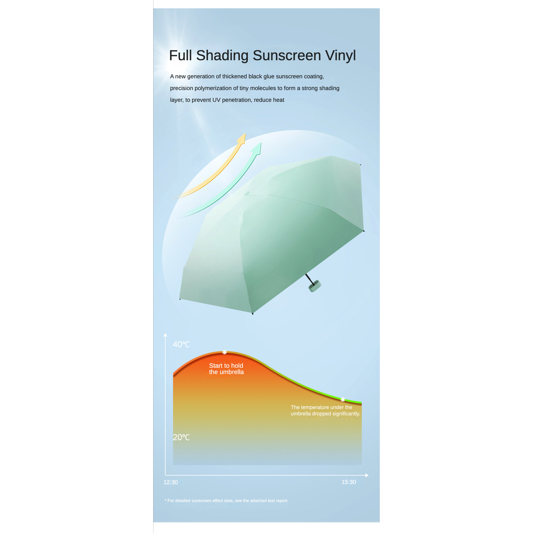 Keunggulan : - Dengan Teknologi waterproof, cukup digoyang perlahan maka air akan bersih dari permukaan payung - Vinyl Coating warna bagian dalam berwarna HITAM - Terdiri dari 5 lapisan - kepala pegangan payung gepeng, sehingga mudah di bawa saat masukkan ke dlm tas. - Dengan 6 tulang penyangga sehingga tahan terhadap terpaan angin - UPF50+ UV blocking. - ringan dan kecil, didesign muat kedalam tas kecil - cocok digunakan saat matahari terik dan hujan.