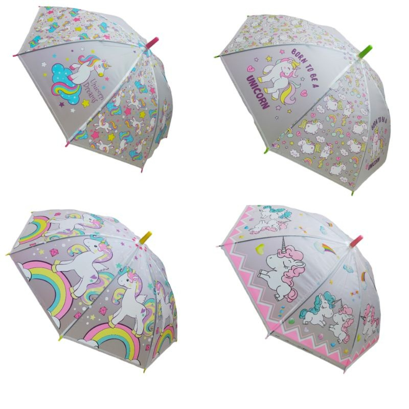Payung tongkat anak unicorn / payung anak transparan kuda poni gagang / transparant doff dov pony ada peluit