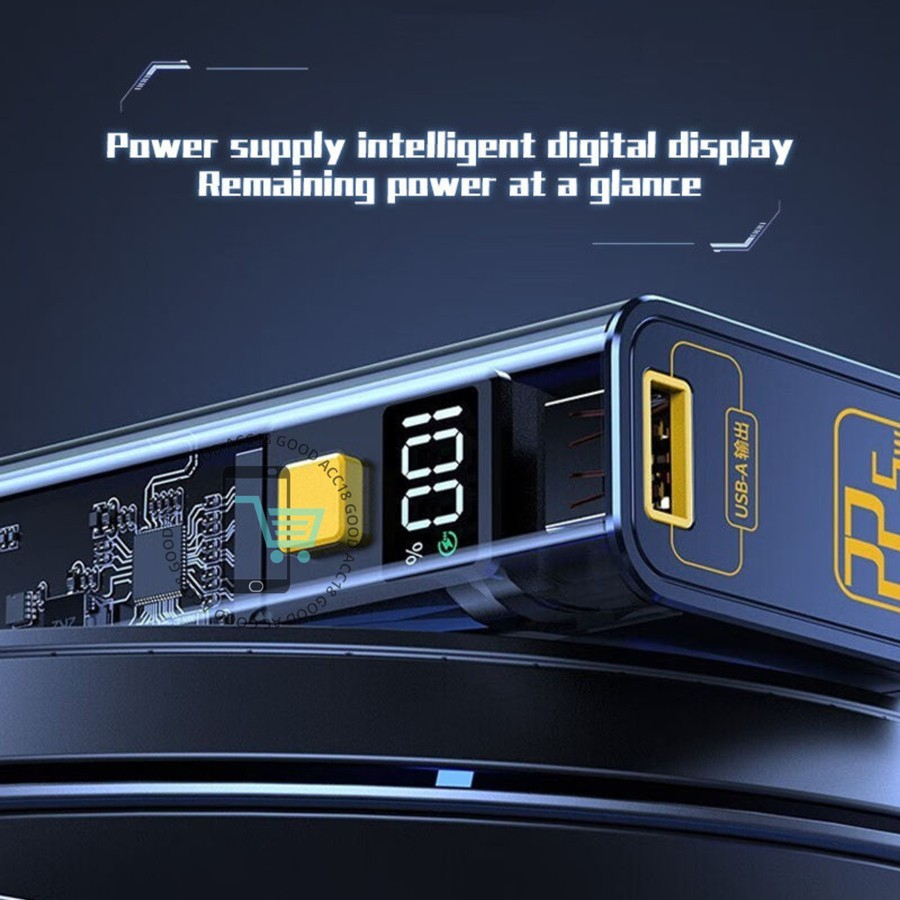 Spesification : • Product Model : PT-22 • Battery Type : li-polymer battery • Capacity : 16.800mAh • Output Port : → USB : 4.5V-5A/5V-3A/9V-2A/12V-1.5A 22.5W(Max) → Type-C Output : 5V-3A/9V-2.2A/12V-1.67A PD20W • Input Port : → Type-C Port : DC5V-3A/9V-2A/12V-1.5A • Size : 3X16X6CM