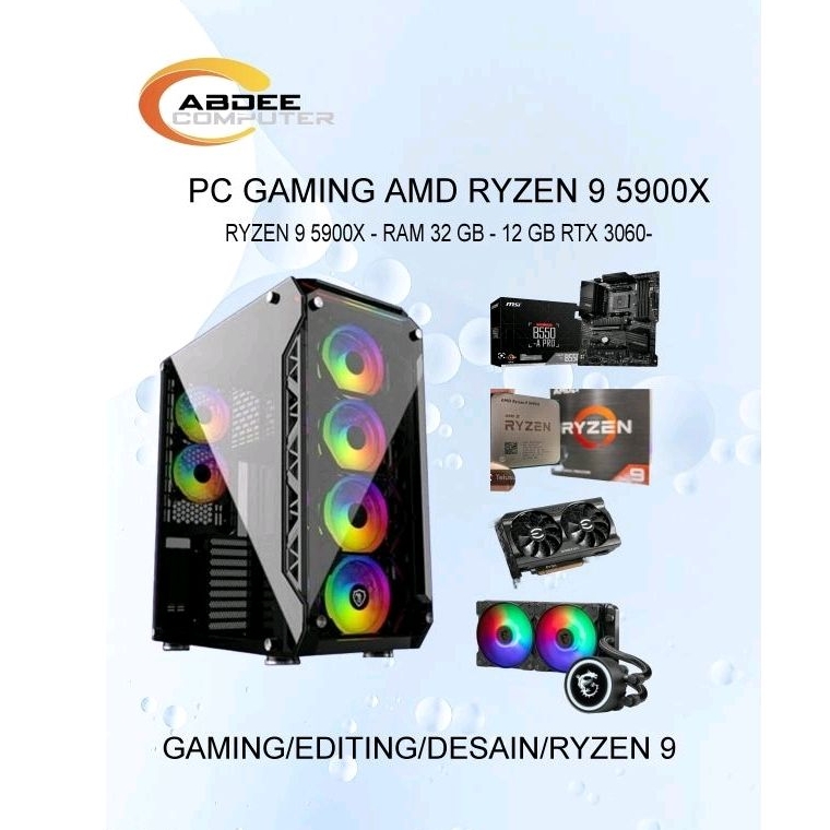 • PROCESOR AMD RYZEN 9 5900X • MOTHERBOARD MSI B550 A- PRO • MEMORI 32 GB ( 16 X 2 ) PC 3200MHZ • NVME 256 GB • HARDISK 1 TERA SEAGATE • VGA 12 GB RTX 3060 DDR6 • SOUND INTGERATED • LANDCARD INTEGERATED • CASE GAMING DA N23 / GAMEMAX WHITE • POWER SUPPLY CORSAIR CV650 WATT • FREE USB WIFI TP LINK • LIQUID MSI MAG B240