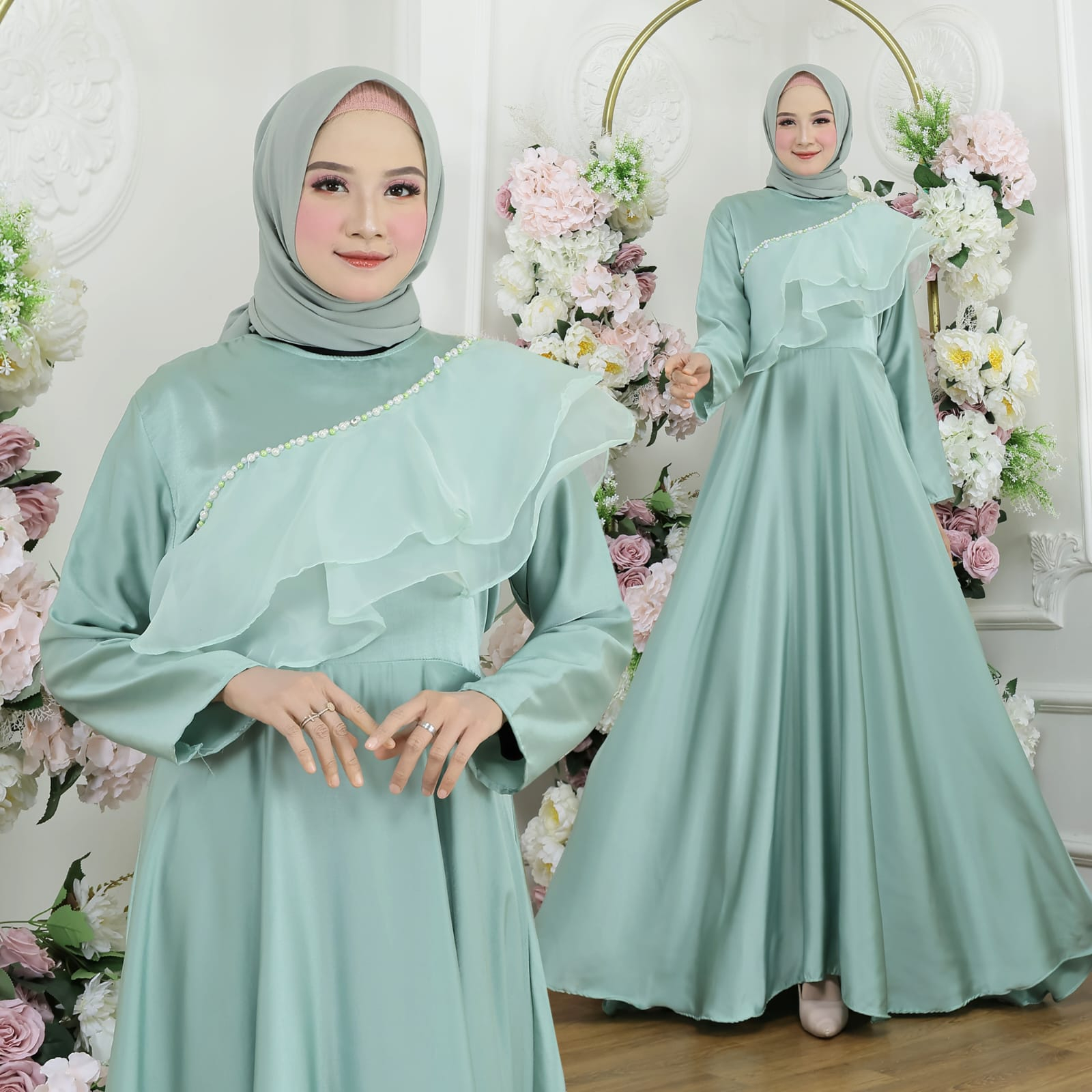 Detail : ⭐ Bahan Maxmara Premium Halus dan Adem Aplikasi Organza dan Mote Jahit Tangan Sleting Belakang, Tali Pinggang Nyatu Baju ⭐ Lebar Dada (LD) +/- 100cm Panjang Baju (PB) +/- 135cm ⭐ No Jilbab ⭐ UKURAN ALLSIZE