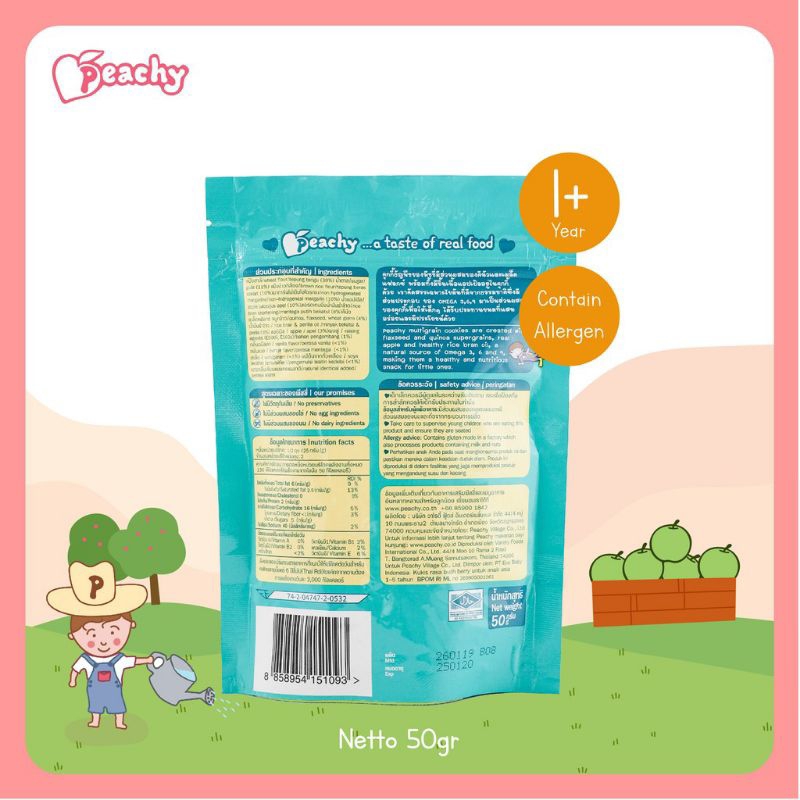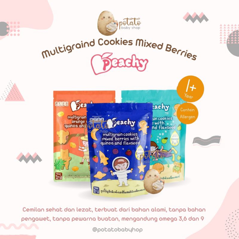 Peachy Multigrain Cookies merupakan camilan sehat dan lezat untuk si Kecil yang dibuat dengan perpaduan Quinoa dan Flaxseed yang kandungan protein nya setara dengan ikan. Dibuat dengan berbagai bentuk yang unik dan memiliki potongan buah-buahan asli di dalam biskuitnya. Bebas dari pewarna, perasa, dan pengawet. Moms tidak perlu repot lagi memilih camilan yang sehat untuk si Kecil sehari-hari.