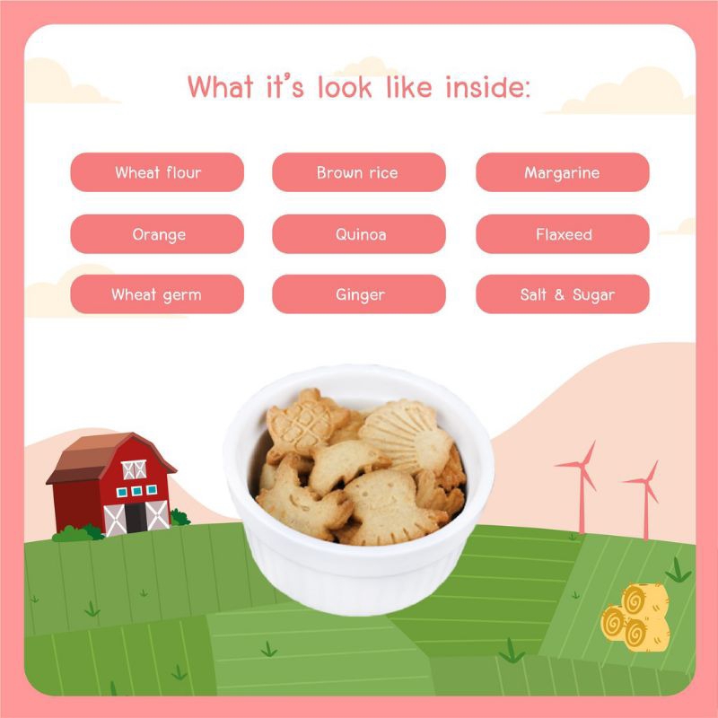- Peachy Multigrain Cookies Orange with Quinoa and Flaxseed Tepung Terigu, Jeruk, Beras Merah, Gula, Margarin, Biji Gandum, Biji Rami, Garam, Jahe, Lesitin Kedelai, Minyak Perilla, Bibit Gandum