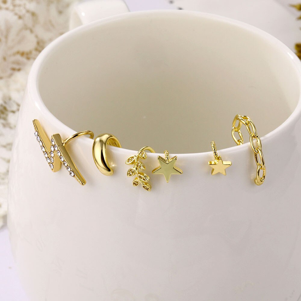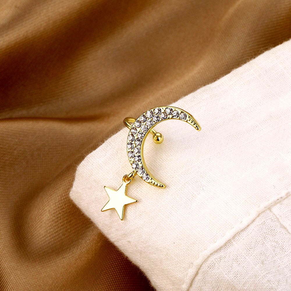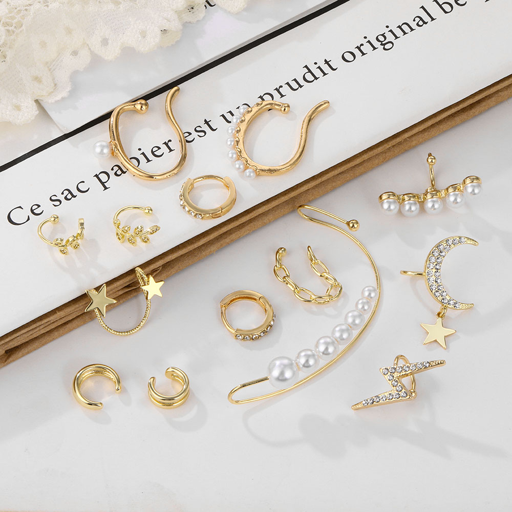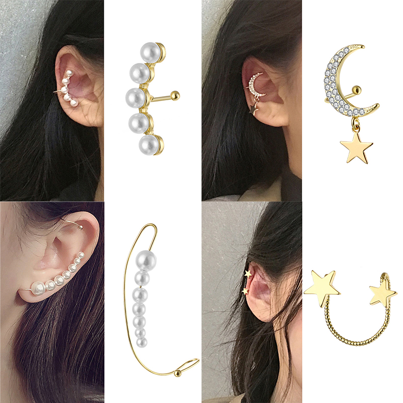 Detail Pearl chain Ear clip Non-hole Earrings Bohemian Crystal Stud Earrings For Woman Lightning Stars moon Fashion Jewelry