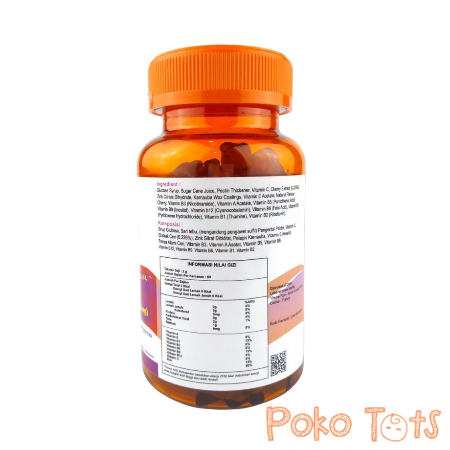 The PEDIAKID ® Gusi multivitamin mengasosiasikan 14 Vitamin dan Mineral dan ekstrak dipatenkan dari 22 Buah & Sayuran untuk memastikan asupan mikronutrien penting untuk anak. Kaya Vitamin A, C, E, K, B1, B2, B3, B5, B6, B8, B9, B12, dalam Selenium dan Seng, PEDIAKID® Multivitamin Gusi berkontribusi pada berfungsinya sistem kekebalan tubuh, sistem saraf dan sistem psikologis , dan membantu mengurangi kelelahan. Dirancang untuk anak-anak, PEDIAKID® Multivitamin Gusi menawarkan formula praktis, menyenangkan dan alami. Gusi berbentuk beruang ini bebas gelatin, bebas pengawet, bebas gluten, bebas laktosa, perasa dan warna buatan.