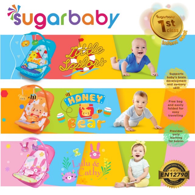 Sugar Baby Fold Up Infant Seat Terdiri dari 2 warna yaitu biru dan pink Fungsinya adalah sbb: •dapat digunakan untuk tempat memberi makan bayi, tidur bayi, dan tempat main bayi • sangat cocok dan sangat nyaman buat bepergian karena dilengkapi travel bag • Dilengkapi musik dan getaran lembut yang menenangkan bayi • Dilengkapi tiga point pengaman untuk menjaga bayi agar tetap aman • Terdapat dua buah mainan gantung lucu dan unik yang dapat dengan mudah dijangkau oleh bayi dan dapat digeser untuk menyesuaikan dengan postur dan posisi bayi • Mudah dibersihkan dan kain dudukannya dapat dicuci dengan mesin cuci •Posisi sandaran dapat disesuaikan, terdapat tiga posisi sandaran