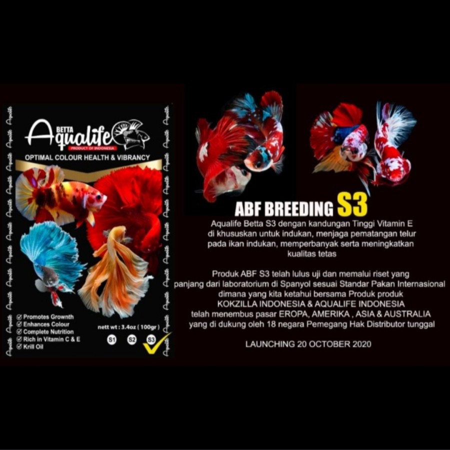 Aqualife Betta S3 dengan kandungan Tinggi Vitamin E, dikhusukan untuk indukan, menjaga pematangan telur pada ikan indukan, memperbanyak serta meningkatkan kualitas tetas.