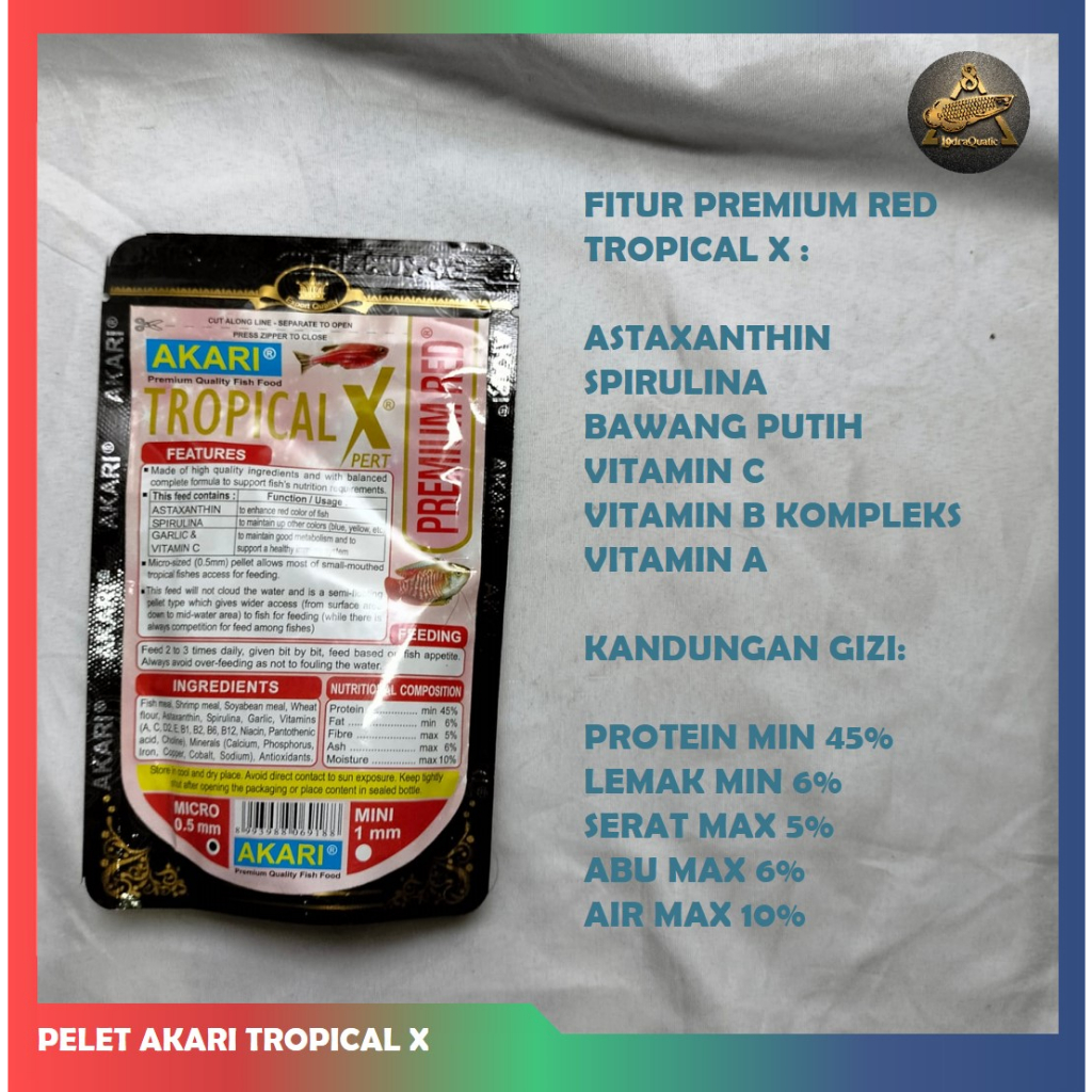 PELET AKARI TROPICAL X ADALAH PELET KUALITAS EKSPOR DENGAN BAHAN BAHAN PREMIUM DAN BERKUALITAS TINGGI. PELET INI DIRANCANG UNTUK MENDUKUNG PERTUMBUHAN DAN PERKEMBANGAN BADAN IKAN HIAS TROPIS. MENGANDUNG FORMULASI KHUSUS ANTI STRESS SEHINGGA IKAN HIAS MEMILIKI DAYA TAHAN TUBUH YANG KUAT DALAM BERBAGAI KONDISI SEHINGGA TIDAK MUDAH SAKIT.