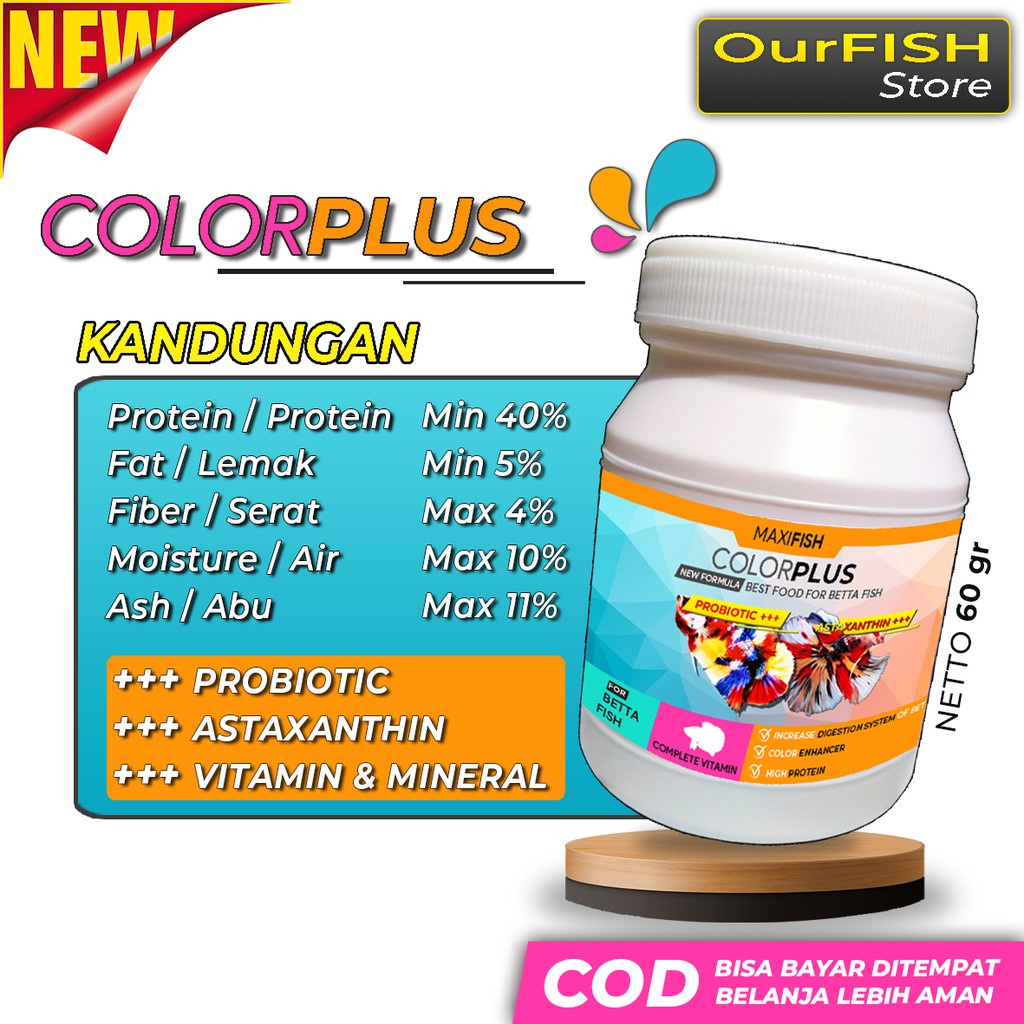 π Pembayaran sebelum pk 14.00 WIB (Senin-Jumat) pk 12.00 WIB (Sabtu) akan diproses di hari yang sama COLORPLUS merupakan pakan ikan hias (cupang, guppy, dsb) yang diformulasikan untuk meningkatkan pertumbuhan dan mempertegas warna karena mengandung astaxanthin. Selain itu, pakan ini dilengkapi dengan probiotik untuk meningkatkan pencernaan dan imunitas ikan serta kotoran yang dihasilkan pun lebih sedikit.