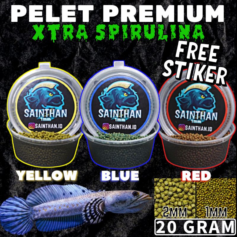 Pelet Premium Blue, Yellow, Red Ekstra Spirulina By SaintHan Tersedia Size 1mm dan 2mm kemasan 20g