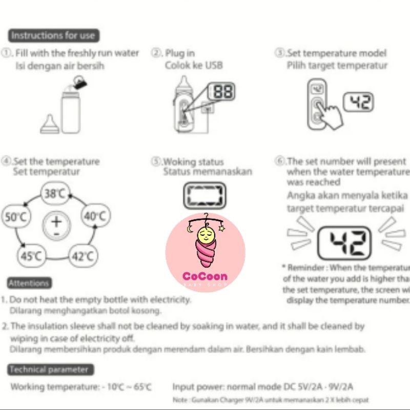 Produk ini adalah pemanas portabel dan bukan pemanas cepat. Produk dirancang untuk memanaskan secara perlahan dan menjaga susu / ASI pada suhu yang ideal dan juga meminimalisasi kehilangan nutrisi (Produk akan menjaga suhu konstan sesuai