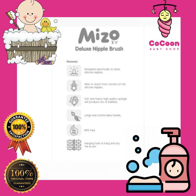 MIZO Deluxe Nipple Brush / Sikat Dot Bayi Mizo merupakan sikat dot bayi berbahan berkualitas yang dapat membersihkan dan menjangkau sebagian besar sudut puting silikon. Lembut dan berbusa spons berkualitas tinggi akan menghasilkan banyak gelembung dan ada lubang gantung untuk menggantung dan mengeringkan sikat. BPA Free