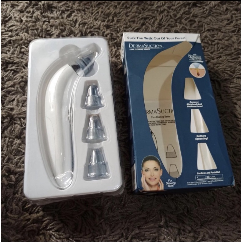 DermaSuction memiliki 4 kepala isap yang dapat dipertukarkan untuk ekstraksi sempurna. Setelah selesai, cukup bilas kepala penghisap yang kotor di bawah air. Jangan berhenti di wajah Anda gunakan DermaSuction untuk menghilangkan kotoran dari seluruh tubuh Anda. DermaSuction adalah alat pembersih yang dapat menyedot kotoran di wajah anda tanpa merasakan sakit.