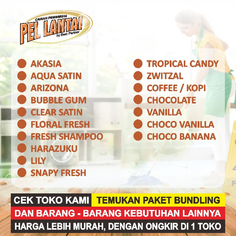 Cairan pembersih lantai / Pembersih lantai superpel wangi dengan konsentrasi tinggi. efektif untuk membersihkan kotoran, serta membunuh kuman pada lantai,bau tak sedap dilantai sehingga ruangan menjadi bersih, harum, sehat dan segar.