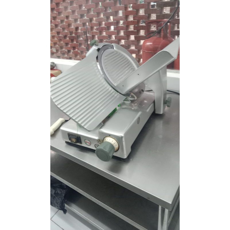 Spesifikasi: Tipe: Semi Otomatis Bahan: Aluminium dan Pisau Stainless Steel Diameter Pisau: 250mm Range Ketebalan pengirisan: 1 - 15mm (bisa diatur dengan knob ketebalan)