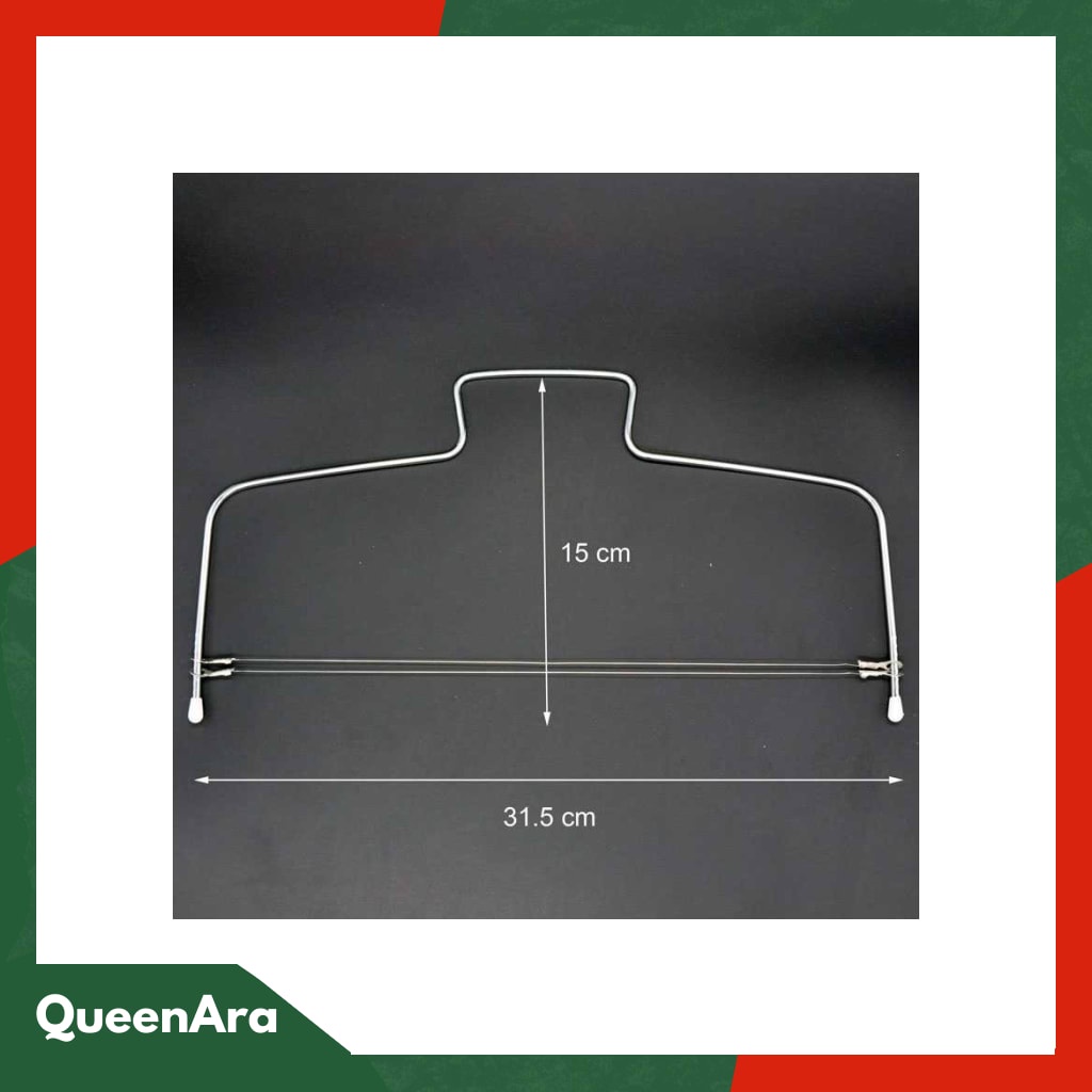 Informasi Produk Pemotong Kue Adjustable Wire Cake Cutter Slicer Leveler Alat ini berfungsi untuk memotong kue secara horizontal secara rapi. Cocok digunakan untuk memotong kue cake untuk membuatnya bertingkat dengan menambah cream pada bagian tengah kue cake. Fitur Alat pemotong kawat Bagian pemotong pada alat ini terbuat dari benang besi yang tipis sehingga dapat memotong kue dengan rapi. Besi tahan karat Pemotong kue ini terbuat dari bahan stainless steel sehingga tidak dapat berkarat dan awet digunakan dalam jangka waktu lama. Kelengkapan ProdukBarang-barang yang anda dapat dalam kotak produk: 1 x Pemotong Kue Adjustable Wire Cake Cutter Slicer Leveler