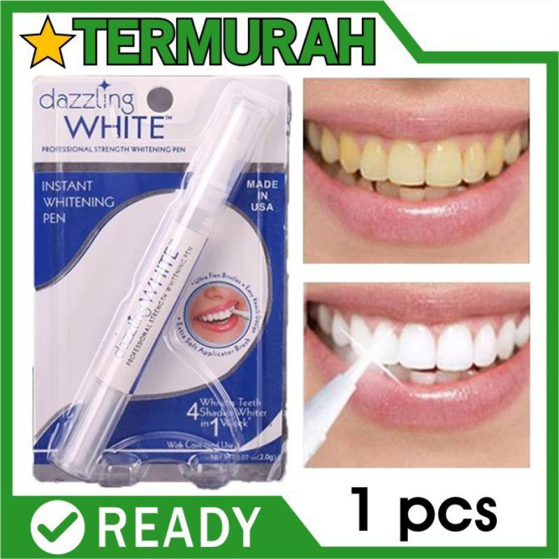 Mau gigi lebih putih dan bersih? Capek dijanjikan pasta gigi pemutih yg hasilnya gigi tetap kuning? Cobain produk pemutih gigi dari USA ini. Produk ini mengandung zat aktif sama yg dipakai oleh dokter gigi2 terkemuka di klinik. Tidak membuat gigi keropos, dan putihnya awet asal kamu gak terlalu heboh minum kopi atau merokok yaa . Cara penggunaan dan Ketentuan (WAJIB DIPATUHI). Baca lengkap ya dear: . 1. Kocok gel pen selama 5 detik atau lebih 2. Lepaskan tutup dari ujung sikat 3. Putar searah jarum jam beberapa kali, pada awal pemakaian biasanya perlu berulang kali, hingga gel menutupi ujung sikat 4. Oleskan gel tipis tipis di gigi dan hindari terkena gusi atau bibir 5. Putar pen untuk mengeluarkan gel lebih banyak saat pemakaian 6. Pastikan seluruh area gigi terlapisi dengan gel 7.Tunggu 20 detik hingga gel mengering di gigi sebelum bersentuhan dengan bibir dan lidah 8. Biarkan gel selama 10 menit lalu lap 9. Bilas mulut dengan air hingga bersih 10. Jangan makan atau minum selama 30 menit setelah pemakaian 11. Ulangi pemakaian hingga hasil yg diinginkan didapat. Jangan gunakan lebih dari 2 kali sehari 12. Sebaiknya sikat gigi setelah pemakaian Dazzling White saja Bila gigi jadi sensitif setelah pemakaian, bilas mulut dengan air dan sikat gigi setelah 1-2 jam . Peringatan 1.Gunakan sesuai petunjuk dan tidak untuk dipakai anak di bawah usia 14 tahun karena kandungan Peroxide 2.Pemakaian berlebihan mungkin akan menyebabkan gigi sensitif. Jangan gunakan bila alergi terhadap zat yg ada di produk ini, dan hentikan pemakaian jika ada iritasi atau terjadi bengkak. Konsultasi ke dokter jika gejala muncul 3. Hanya untuk pemakaian luar. Jangan ditelan. Jangan pakai lebih dari 2x sehari 4. Jangan terkena pakaian karena dapat mengubah warna dan membuat luntur warna garmen/kain