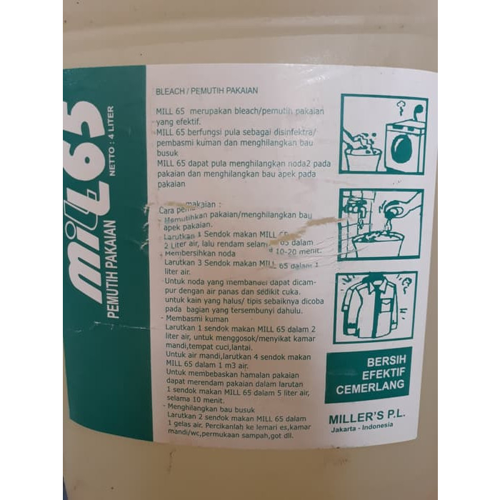 **Produk cair hanya utk wilayah Jabodetabek, lebih disarankan dengan gosend/grab*** Pemutih Pakaian / Bleach Merk Mill65 merupakan pemutih pakaian yang efektif. Berfungsi pula sebagai disinfektra / pembasmi kuman dan menghilangkan bau busuk. Mill65 dapat juga menghilangkan noda noda pada pakaian dan menghilangkan bau apek pada pakaian. Cara Pemakaian : 1. Utk memutihkan pakaian/menghilangkan bau apek pakaian * Larutkan 1 sendok makan mill65 ke dalam 2 liter air, lalu rendam selama 10-20menit 2. Utk membersihkan noda * Larutkan 3 sendok makan mill65 ke dalam 1 liter air. Utk noda membandel dapat dicampur dengan air panas dan sedikit cuka. Untuk kain yang halus/tipis sebaiknya dicoba pada bagian yang tersembunyi dahulu. 3. Membasmi kuman * Larutkan 1 sendok makan mill65 ke dalam 2 liter air lalu bisa digunakan untuk menggosok/menyikat kamar mandi, tempat cuci, lantai. Untuk informasi detail baca petunjuk dan cara pemakaian yg tertera pada label kemasan.