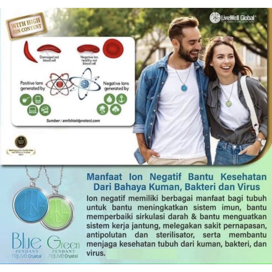 Liontin penunjang kesehatan dengan kadar ion negatif tinggi. Ion negatif berkhasiat bagi kesehatan tubuh, : - membantu meningkatkan sistem imunitas tubuh, bantu memperbaiki sirkulasi darah - Membantu memperbaiki kualitas tidur, antipolutan, - Menangkal radiasi elektromagnetik dari alat elektronik seperti handphone ,gadget dll - banyak manfaat lainnya