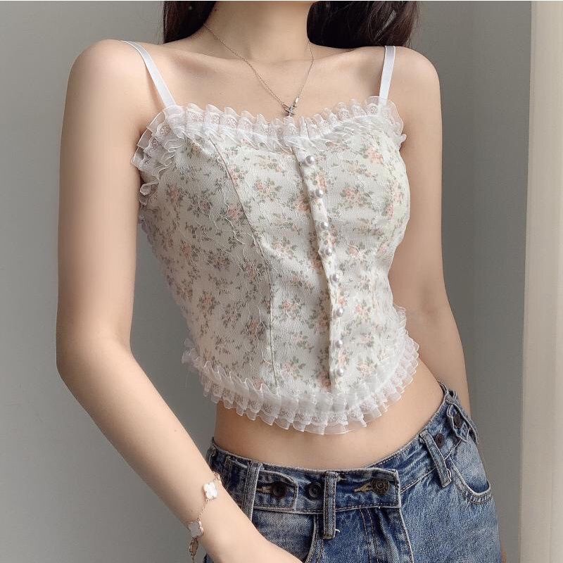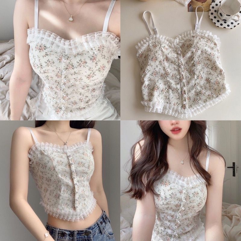 Pakaian Wanita > Atasan > Tanktop & Kamisol > Penelope Tank Top vintage flower Lace pearl/lolita tanktop crop brukat Renda korea/ kamisol Atasan Tanpa kawat Cup Busa kawaii kiyowo