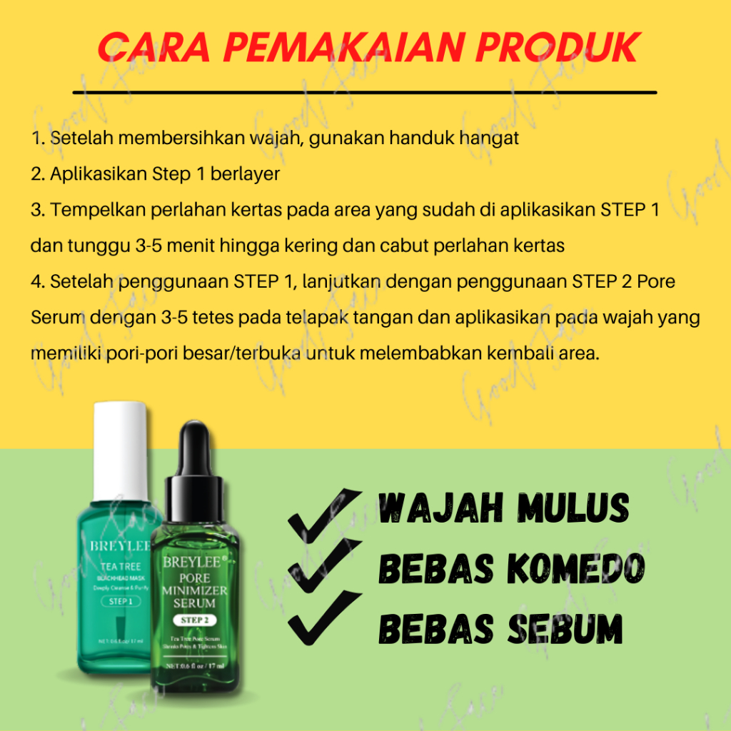 NA11220200131 - blackhead remover NA11201200797 - pore minimizer [Nama Produk] BREYLEE Blackhead Mask/17ml/ Termasuk 100PCS paper (didalam box STEP 1) BREYLEE Pore Refining Serum/17ml [INDIKASI] Membersihkan secara dalam komedo dan membantu mengecilkan pori-pori wajah. [CARA PENGGUNAAN] 1. Setelah membersihkan wajah, gunakan handuk hangat untuk membuka pori-pori wajah 2. Aplikasikan Step 1 berlayer mulai dari medium hingga tebal pada area yang diinginkan. (Hindari penggunaan pada area Alis, rambut, area mata dan mulut. 3. Tempelkan perlahan kertas pada area yang sudah di aplikasikan STEP 1 dan tunggu 3-5 menit hingga kering dan cabut perlahan kertas sesuai arah jalur area yang ditempelkan. 4. Setelah penggunaan STEP 1, lanjutkan dengan penggunaan STEP 2 Pore Serum dengan 3-5 tetes pada telapak tangan dan aplikasikan pada wajah yang memiliki pori-pori besar/terbuka untuk melembabkan kembali area. Pijat hingga produk terserap sempurna. Note: REKOMENDASI UNTUK DIGUNAKAN MAKSIMAL 2x SEMINGGU! Catatan: Direkomendasikan untuk menggunakan langkah1 dan langkah2 secara bersamaan CATATAN: 1. Mohon untuk bisa mengirimkan Video Unboxing paket,Foto Resi dan Foto Produk Berkendala/ Rusak. Sehingga jika ada Kerusakan, Kekurangan Produk/Hadiah, atau Ketidaksesuaian Produk yang diterima bisa dilakukan validasi melalui kelengkapan tersebut. 2. Jika tidak memiliki 2 kelengkapan yang disebutkan, maka segala bentuk komplain yang masuk tidak bisa ditindak lanjuti atau dianggap tidak sah. *kecuali: memang ada kesalahan dari sisi Penjual 3. Kerusakan packaging hanya pada bagian luar (bagian dalam utuh, produk tidak ada kerusakan/kekurangan, dll) disebabkan penanganan paket dari Pihak Jasa Ekspedisi yang kurang baik. Diharapkan agar Pembeli bisa melakukan komplain langsung ke Pihak Jasa Ekspedisi.