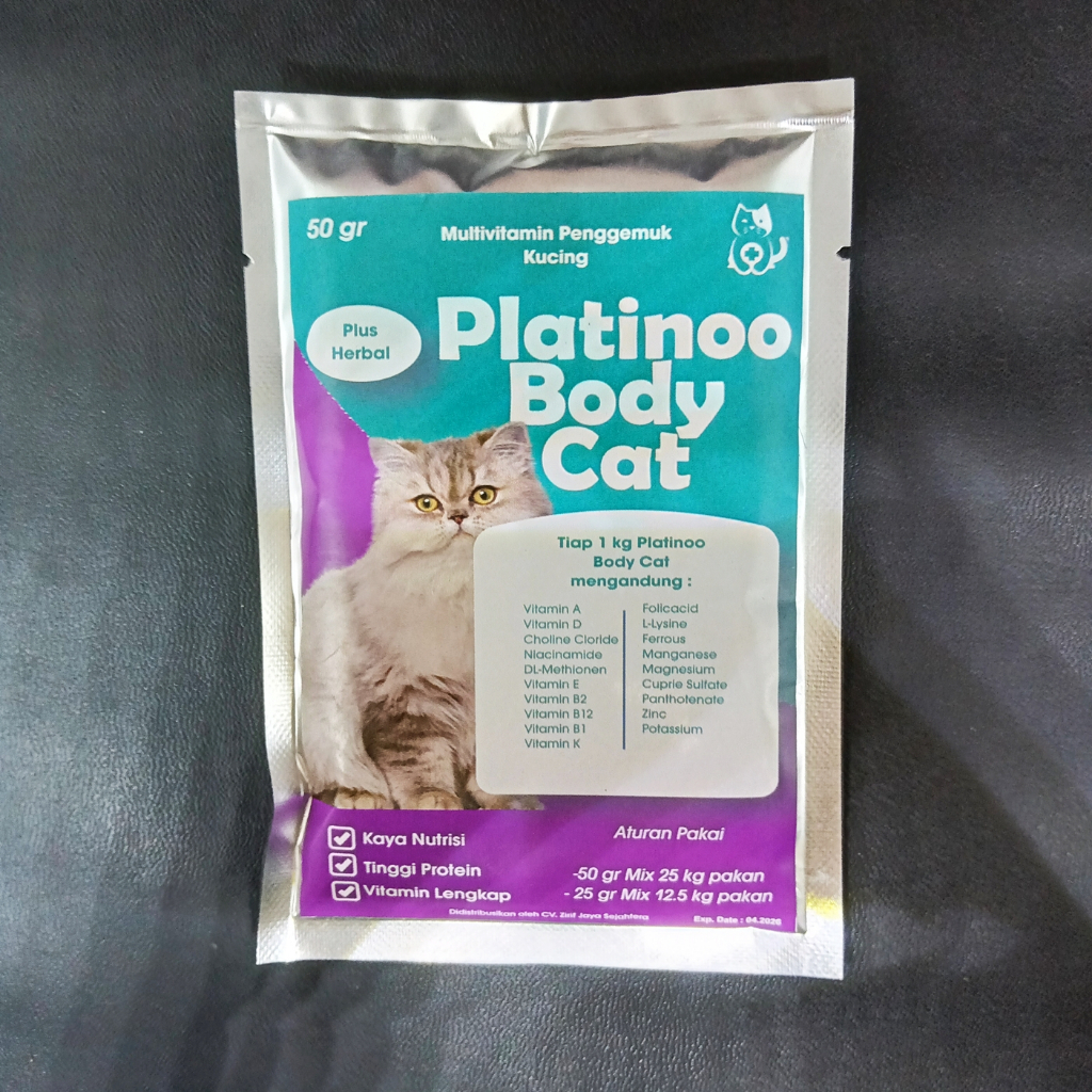 Platinoo Body Cat mengandung Vitamin A dan D dosis tinggi, serta protein dan l-lysine yang dibutuhkan oleh mpus kesayangan dalam mensponsori tubuh gembul.