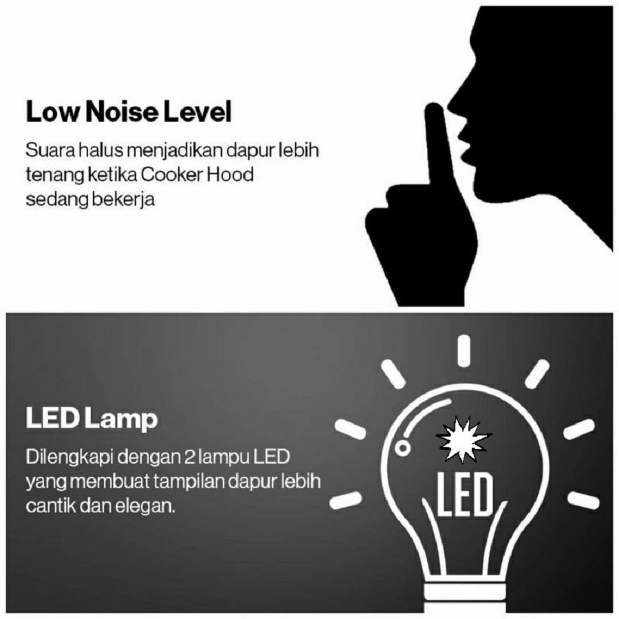 Dengan sirocco fan yang menjadikan suara halus, lebih tenang dan daya hisap lebih kuat. Memiliki push botton yang didesain canggih untuk pengaturan yang memudahkan dalam penggunaan cooker hood. Adanya 2 lampu LED yang memberikan tambahan penerangan pada area memasak dan hemat listrik. Memiliki standar SNI yang menjamin keamanan dan kenyamanan ketika digunakan.