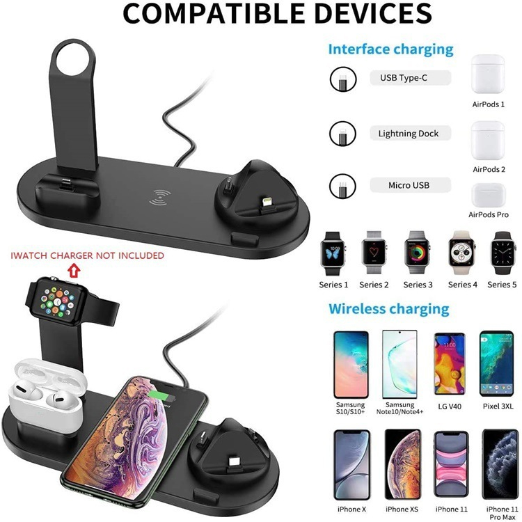Highlight: • 【4 in 1 Wireless Charger Stand】 Dudukan pengisi daya multifungsi dengan antarmuka Untuk iPhone/Mikro/Tipe-C dapat mengisi daya untuk hampir semua perangkat seluler, seperti Untuk iPhone, Untuk iPad, Untuk Samsung, Untuk LG, Untuk HTC, Untuk Huawei, Untuk Sony, dan dok pengisi daya dapat bebas diputar 360 derajat. • 【Kompatibilitas】 Kompatibel Universal untuk seri iWatch Untuk iWatch 4/3/2/1, untuk Airpods dan untuk iPhone Xs / Xs Max / Xr / X / 8/8 Plus/ untuk Samsung Galaxy S10/S10 Plus/ S9 / S9 Plus / S8 / S8 Plus / S7 / S7 Edge / S6 Edge Plus / Catatan 9 / Catatan 8. • 【Tagih Maju】 Stasiun pengisian daya menggunakan teknologi kontrol otomatis tercanggih. Perlindungan built-in terhadap overcharge, perlindungan arus lebih dan tegangan lebih, kontrol suhu, deteksi benda asing. Lindungi baterai perangkat Anda dari kerusakan overcharge. • 【Kualitas terbaik】 Bahan Silikon Inovatif, Tanpa menggores iphone/iwatch/airpods Anda yang menghalangi layar atau tepi. Menghiasi kamar tidur, ruang belajar, aula, meja kantor Anda dengan sempurna. • 【Instalasi Mudah】 Pasang saja kabel apel asli ke dalam dudukan, lalu dapat berfungsi sebagai dudukan pengisi daya untuk Anda. Sembunyikan kabel panjang yang berlebihan, buat meja atau nakas Anda rapi dan teratur.