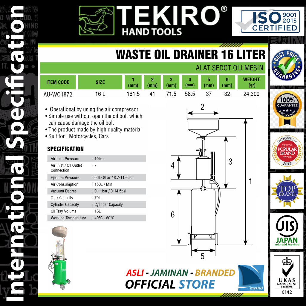 - Penguras Oli Mesin / Pompa Sedot Olie Vacuum ini adalah alat yang dipergunakan untuk menguras oli mesin, baik itu mesin industri, mesin mobil dan motor dengan kapasitas penampungan sampai 16 liter. - Memiliki dua metoda yang dapat dipilih user dalam pengurasan / penyedotan cairan / oli, metode manual atau semi otomatis. - Anda tidak perlu lagi khawatir akan terjadinya kerusakan pada baut penutup bak pembuangan olie yang bakal seleg atau dull / rusak karena aktifitas ganti oli yang sering dilakukan sejak adanya alat ini. - Alat ini juga dapat dipergunakan untuk menguras selain cairan oli dan dapat dipergunakan dalam berbagai aktifitas yang melibatkan kebutuhan menguras cairan. - Ketinggian dari wadah penampungan olie / cairan dapat diatur pada alat ini saat terjadinya pengurasan. - Memiliki tabung penampungan cairan / olie hasil pengurasan yang transparan sehingga memudahkan bagi pengguna mengamati cairan / olie yang terkuras. - Tahan panas, dimana cairan yang disedot melalui alat ini tidak perlu harus menunggu dingin dulu, langsung bisa ditangani alat ini dengan suhu max 80 derajat Celcius. - Petunjuk penggunaan ada di dalam kemasan paket. - Produk ini sangat berkualitas. - JAPAN INDUSTRIAL STANDARD (JIS) - Merk : TEKIRO.