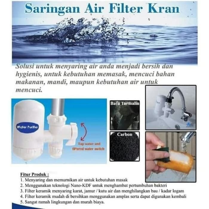 Fitur: - Menyaring dan memurnikan air Anda, memberikan keluarga Anda hanya air yang terbaik dan sehat. - Filter air keran ini dapat menghasilkan air yang sangat murni langsung dan membantu Anda membuat kopi dan teh yang terbaik. - Switch antara air yang disaring dan air keran fleksibel menggunakan teknologi Nano-KDF untuk menghambat pertumbuhan bakteri. - Cartridge Keramik Penyaringan dapat dibersihkan dengan mudah dan digunakan lagi. Anda dapat melihat berapa banyak kotoran itu telah disaring. - Jika kualitas air di daerah Anda benar-benar buruk, hanya cukup membersihkan filter lebih sering. Sangat ramah lingkungan dan murah biaya. - Alat ini juga dilengkapi dengan 3 sendi kran agar sesuai jenis keran. Sangat mudah untuk memasang. Tidak ada alat khusus yang diperlukan. - Kran air ini menggunakan Tourmaline untuk menyaring air, turmalin adalah batu permata alami.
