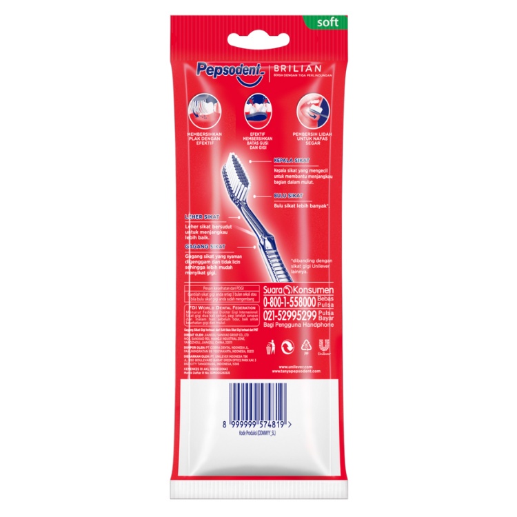 Pepsodent Sikat Gigi Brilian memiliki bulu sikat yang halus dan lebih rapat sehingga efektif untuk membersihkan dan menghilangkan plak hingga ke sela – sela gigi. Dilengkapi pembersih lidah untuk nafas lebih segar. Desain pegangan sikat gigi yang nyaman digenggam membuat sikat gigi lebih mudah digunakan.