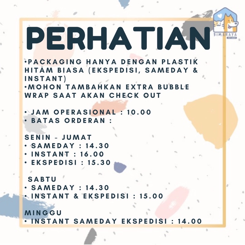 MOHON DIBACA KEMBALI KEBIJAKAN TOKO BIMARAYA PETSHOP MEMBELI = SETUJU • PENGIRIMAN HANYA DENGAN PLASTIK BIASA. JANGAN KOMPLAIN KARENA SETIAP TOKO SUDAH MEMPUNYAI KETETAPAN MASING-MASING. JIKA INGIN TAMBAHAN BUBBLE WRAP, MOHON SEARCH “BUBBLE WRAP” DI TOKO KAMI • PENGIRIMAN DENGAN GOSEND/GRAB HANYA SAMPAI JAM 14.30 LEWAT DARI WAKTU YANG DITENTUKAN AKAN DI KIRIM ESOKNYA. • PENGIRIMAN DENGAN EKSPEDISI LAIN SELAIN GOSEND/GRAB HANYA SAMPAI JAM 15.30 LEWAT DARI WAKTU YANG DITENTUKAN AKAN DIKIRIM ESOKNYA. • KERUSAKAN AKIBAT PENGIRIMAN BUKAN TANGGUNG JAWAB PENJUAL. • TIDAK MENERIMA KOMPLAIN BARANG PENYOK, BARANG RUSAK SETELAH DITERIMA DARI EKPEDISI PILIHAN ANDA KARENA BARANG-BARANG YANG KAMI KIRIMKAN DALAM KEADAAN BAIK DAN DI PACKING DENGAN BAIK SESUAI KETETAPAN TOKO. • TIDAK AKAN PERNAH MENJUAL BARANG RUSAK ATAU CACAT • SEMUA BARANG YANG DIJUAL DIJAMIN ORIGINAL. TIDAK MENERIMA TUDUHAN BARANG TIDAK ORIGINAL TANPA BUKTI JELAS • HARAP SEGERA KONFIRMASI PENERIMAAN SETELAH BARANG DITERIMA