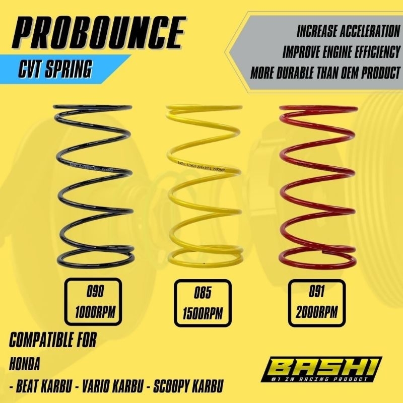 Model : Per CVT Bashi Probounce Spesifikasi : Satu lagi produk terbaru dari bashi , Per CVT Bashi Probounce, dengan teknologi jepang dan material berkualitas serta pembuatan yang presisi, Bashi Probounce sangat cocok untuk kamu yang ingin meningkatkan performa CVT kamu Size : - 1000 RPM - 1500 RPM - 2000 RPM Motorcycle : -SCOOPY semua series - BEAT semua series - VARIO 110 semua series - genio semua series -beat street semua series