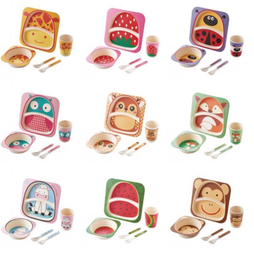 Detail Peralatan Makan Anak Set 5 in 1 Bamboo / Peralatan Makan Bayi Piring Anak Set Sendok Garpu Gelas Mangkok Anak Variasi Desain