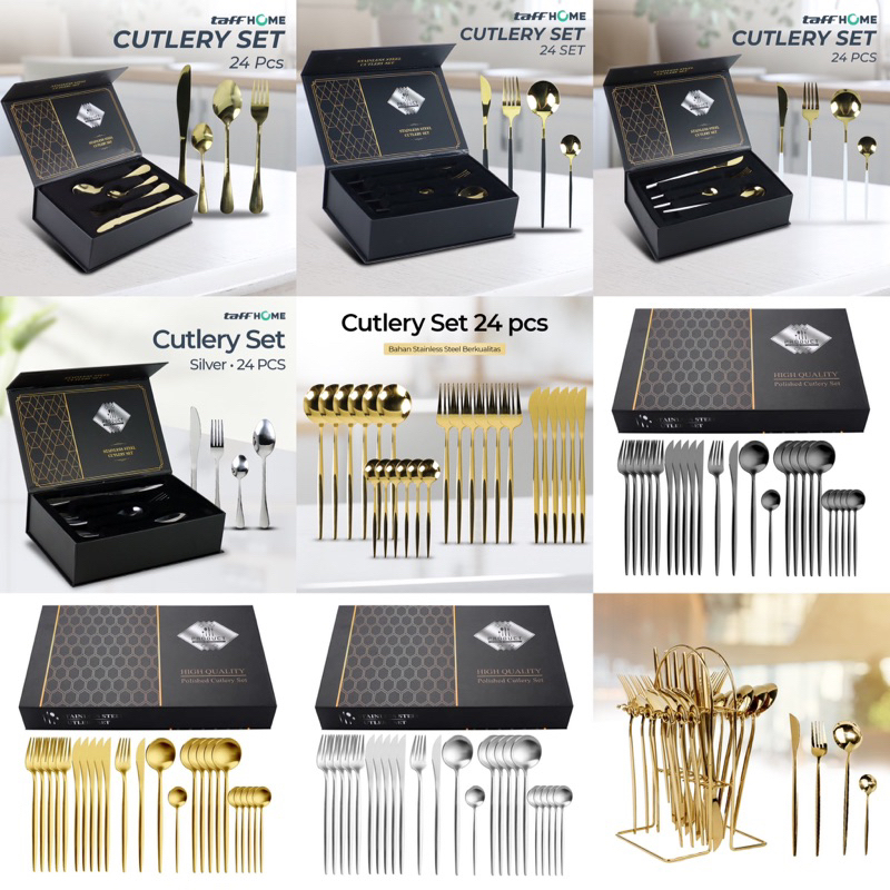 Set perlengkapan makan yang terdiri dari sendok makan, sendok teh, garpu dan pisau yang didesain elegan. Set perlengkapan ini sangat cocok digunakan sebagai perlengkapan makan di rumah. Tampilannya yang mewah cocok digunakan untuk acara makan formal atau informal. Miliki set perlengkapan makan dari TaffHOME sekarang juga.