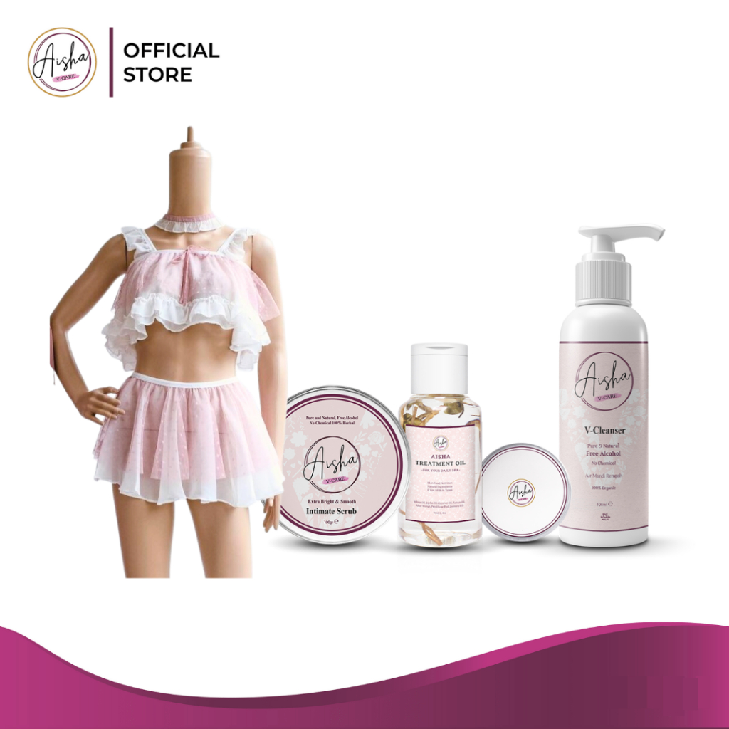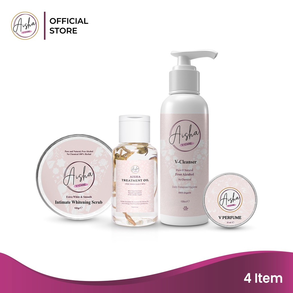 Terdiri dari 4 (empat) produk unggulan: - Aisha V-Cleanser: Efektif membersihkan area kewanitaan, mengatasi dan menghilangkan keputihan, menghilangkan gatal, iritasi, dan juga bau tak sedap di sekitar area kewanitaan. - Aisha V-Perfume: Efektif menghilangkan bau tak sedap di sekitar area kewanitaan, mencegah darah menstruasi/nifas keluar kembali setelah bersuci. - Aisha Intimate Whitening Scrub: Membantu mencerahkan, menghaluskan, dan mengurangi lipatan gelap di sekitar area kewanitaan, selangkangan, ketiak, bokong, atau area lipatan tubuh lainnya. - Aisha Treatment Oil: Diformulasikan khusus untuk perawatan kulit wajah dan tubuh efektif memberikan ekstra nutrisi pada kulit/skin food, menghapus sisa make-up, mencegah penuaan dini, melembapkan dan meremajakan kulit, serta melembutkan kulit kering dan bersisik.
